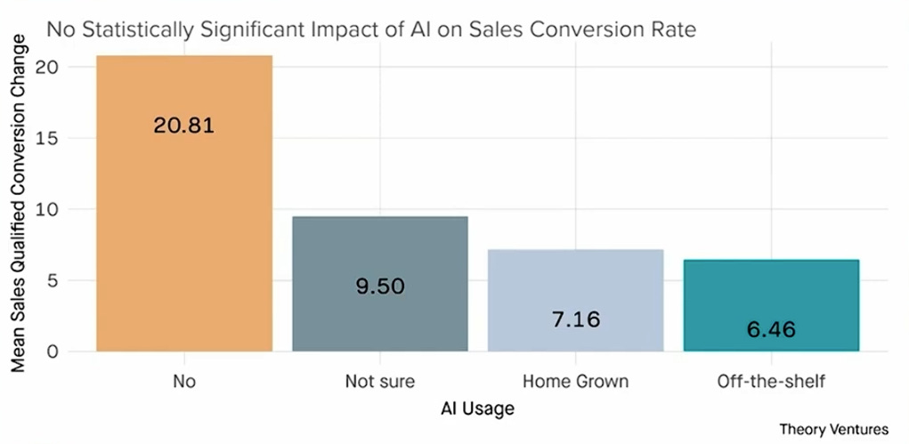 Despite the widespread adoption of AI tools in sales, current data indicates no significant difference in ultimate conversion rates between companies that use AI and those that don't. While AI is generating excitement and perceived efficiency gains, it has yet to demonstrably impact bottom-line sales performance.