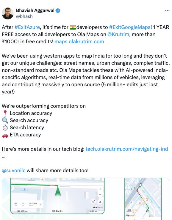 Unlike such nationalistic claims by many companies, the big difference this time is that Ola has Ola electric - i.e. millions of EV bikes using Ola maps, which gives it a strong leverage to collect data on a real time basis (the data may not be at par with Google but I’d like to believe that it will be soon at par with MapMyIndia’s data - which could be a great start).