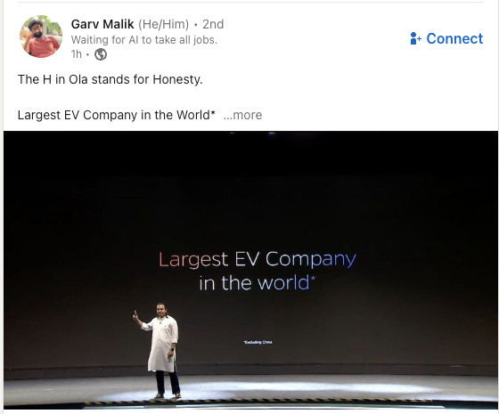 The Internet is full of memes on Ola founder, Bhavish’s claims that Ola is the world’s fourth largest EV company in the world* (* = excluding China).